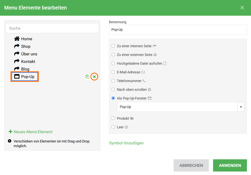 Ihr Pop-Up wird automatisch ins Menü übernommen, sollten Sie das Pop-Up aber nicht als „Link“ im Menü haben wollen, so müssen Sie diesen Link entfernen: