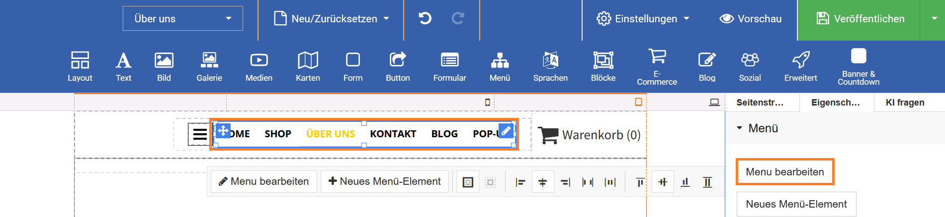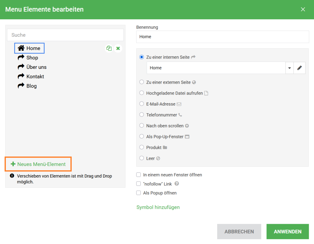 Anschließend wählen Sie rechts unten „+ Neues Menü-Element“.