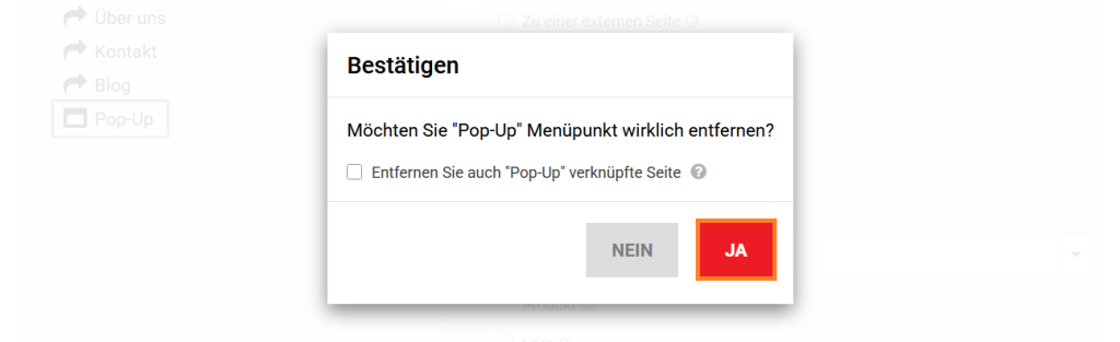 Beim Bestätigen dürfen Sie NICHT die Option „Entfernen Sie auch „Pop-Up“ verknüpfte Seite“ wählen. Diese Option würde nicht nur die Verlinkung im Menü löschen sondern auch das Popup an sich. Anschließend klicken Sie auf auf „anwenden“.