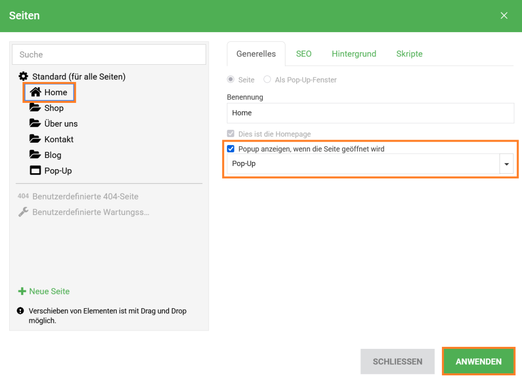 Wählen Sie nun die Seite bei der das Pop-up erscheinen soll an und setzen Sie einen Haken bei „Pop-up anzeigen, wenn die Seite geöffnet wird“. Nun wählen Sie noch Ihr soeben erstelltes Pop-up an.