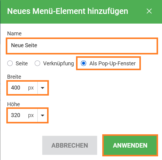 Legen Sie die Größe Ihres Pop-Ups fest und klicken Sie auf übernehmen.