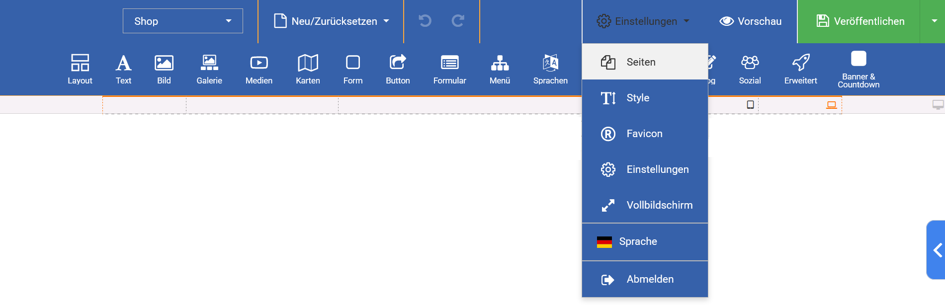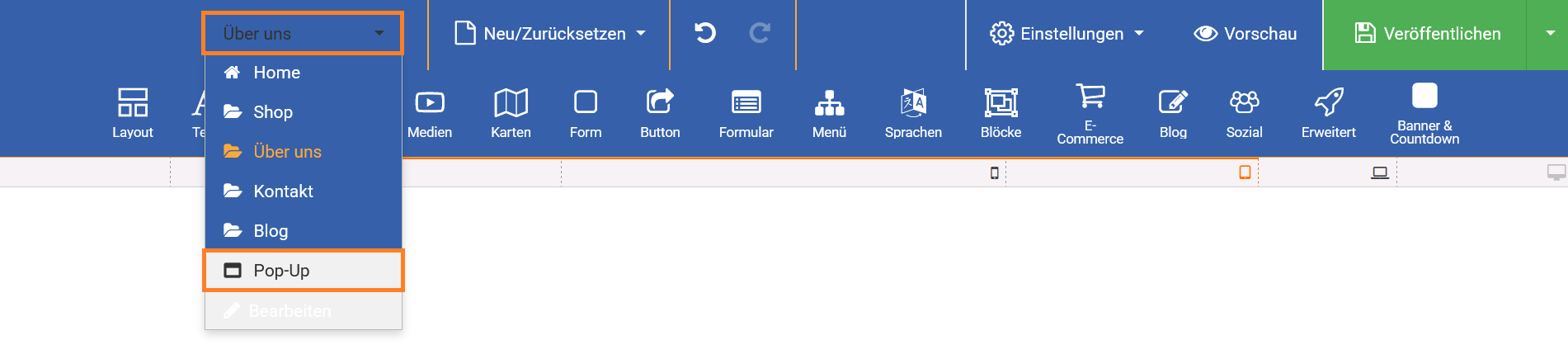 Wählen Sie im Drop-Down-Menü links oben Ihr soeben erstelltes Popup, und schon können Sie mit dem Gestalten Ihres Pop-ups anfangen.