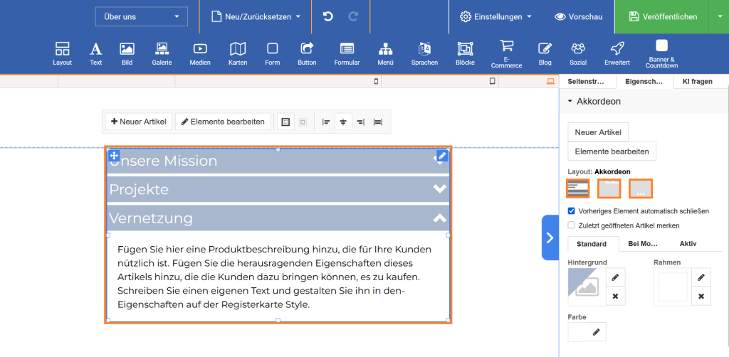 Im rechten Seitenmenü unter dem Reiter „Akkordeon“ können Sie das „Layout“ des Akkordeon Modul zu einer Registerkarte oder zu einem Slider Modul (Schieberegler) umwandeln.